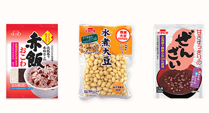 We offer various soybean products such as our “Japan-grown boiled soybeans”. Essential for celebratory occasions, try our “sekihan okowa” (glutinous rice steamed with red adzuki beans). We also produce other products such as our “zenzai” (red bean soup with adzuki beans) made from adzuki beans grown in Tokachi, Hokkaido.