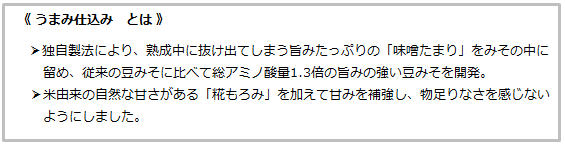 - ・今後も減塩ニーズの高まりが予想される中で、イチビキの技術を結集させた旨みのある減塩みそに、植物由来の乳酸 菌をプラスし、おいしく健康的な生活に役立つ商品を発売します。