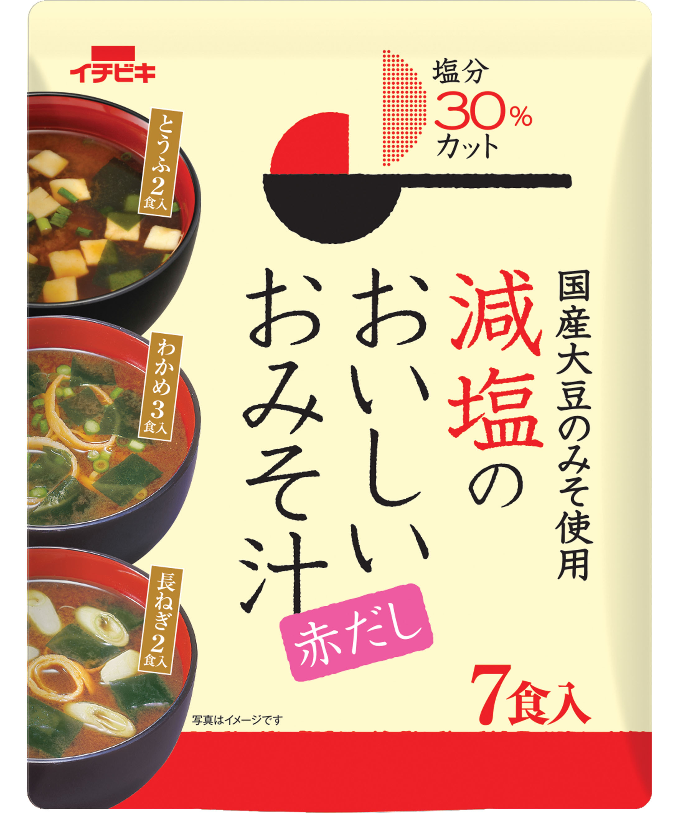 ●イチビキみそ汁標準品(即席生国産10食)に対し、塩分を30%カットしています。
