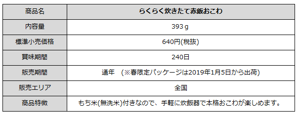 イチビキ株式会社(本社:愛知県名古屋市、代表取締役社長:中村光一郎)は、「らくらく炊きたて赤飯おこわ」に桜の絵柄をあしらった春限定パッケージを2019年1月5日から全国へ出荷します。また、2018年12月24日から、日本最大の料理レシピサービス「クックパッド(※1)」内でタイアッププロモーションを実施し、赤飯市場の活性化を狙います。