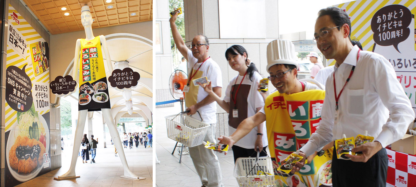 イチビキ株式会社(本社:愛知県名古屋市、代表取締役社長:中村光一郎)は、100周年記念事業の一環として、8月14日(水)から20日(火)まで、名古屋のシンボルである巨大マネキン「ナナちゃん人形」を「献立いろいろみそ」仕様のワンピース姿に変身させました。8月17日(土)、8月18日(日)には「献立いろいろみそミニパック150g」を10,000個配布するサンプリングイベントを行いました。合わせてSNSを使った写真投稿キャンペーンも実施し、イチビキブランドと献立いろいろみその認知拡大を図りました。