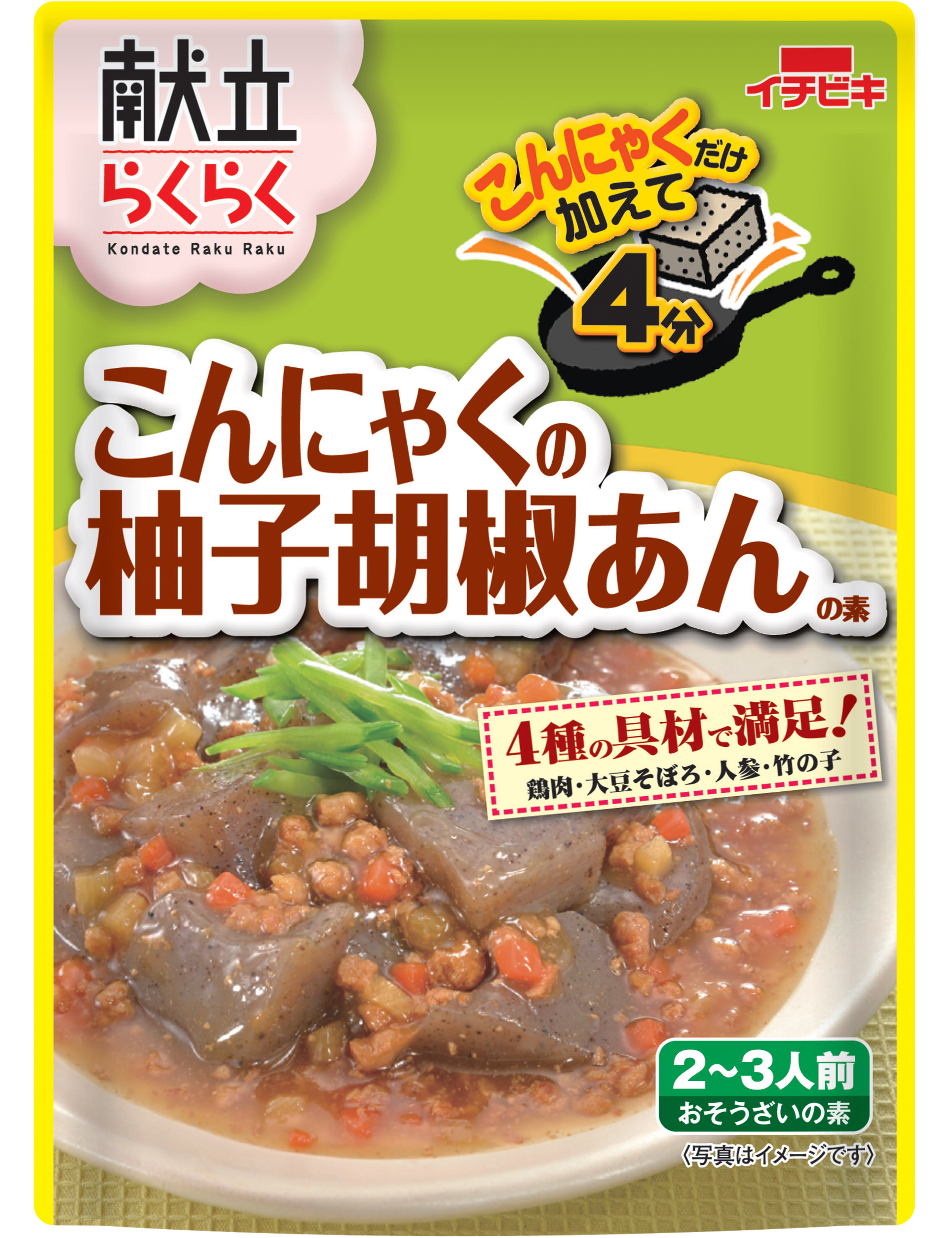 イチビキ株式会社は、身近な食材1品と一緒に炒めるだけの便利な惣菜の素「献立らくらく」シリーズから《こんにゃくの柚子胡椒あんの素》を2017年3月1日より全国へ出荷いたします。