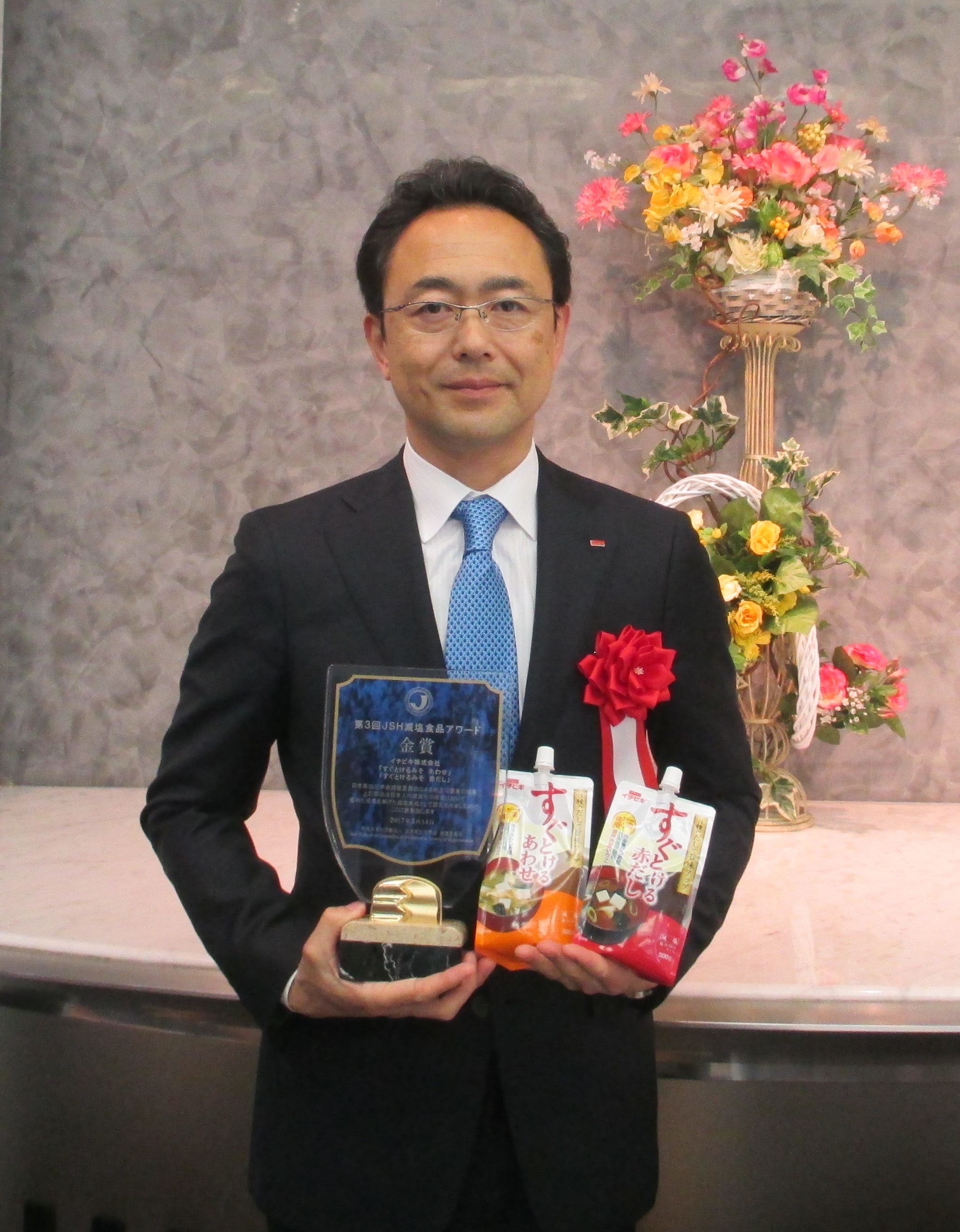 イチビキ株式会社のだし入りみそ2品「すぐとける赤だし」「すぐとけるあわせ」が、特定非営利活動法人 日本高血圧学会 減塩委員会が主催する「第3回JSH減塩食品アワード」で金賞を受賞し、2017年5月14日(日)に第6回臨床高血圧フォーラム(岡山)にて表彰されました。