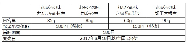 イチビキ株式会社(本社:愛知県名古屋市、代表取締役社長:中村光一郎)は、常温で保存できる便利なパウチ惣菜「おふくろの味」シリーズの新商品として、和惣菜で人気の《さつまいもの甘煮》《かぼちゃ煮》《きんぴらごぼう》《切干大根煮》を発売し、2017年8月18日より全国へ出荷いたします。