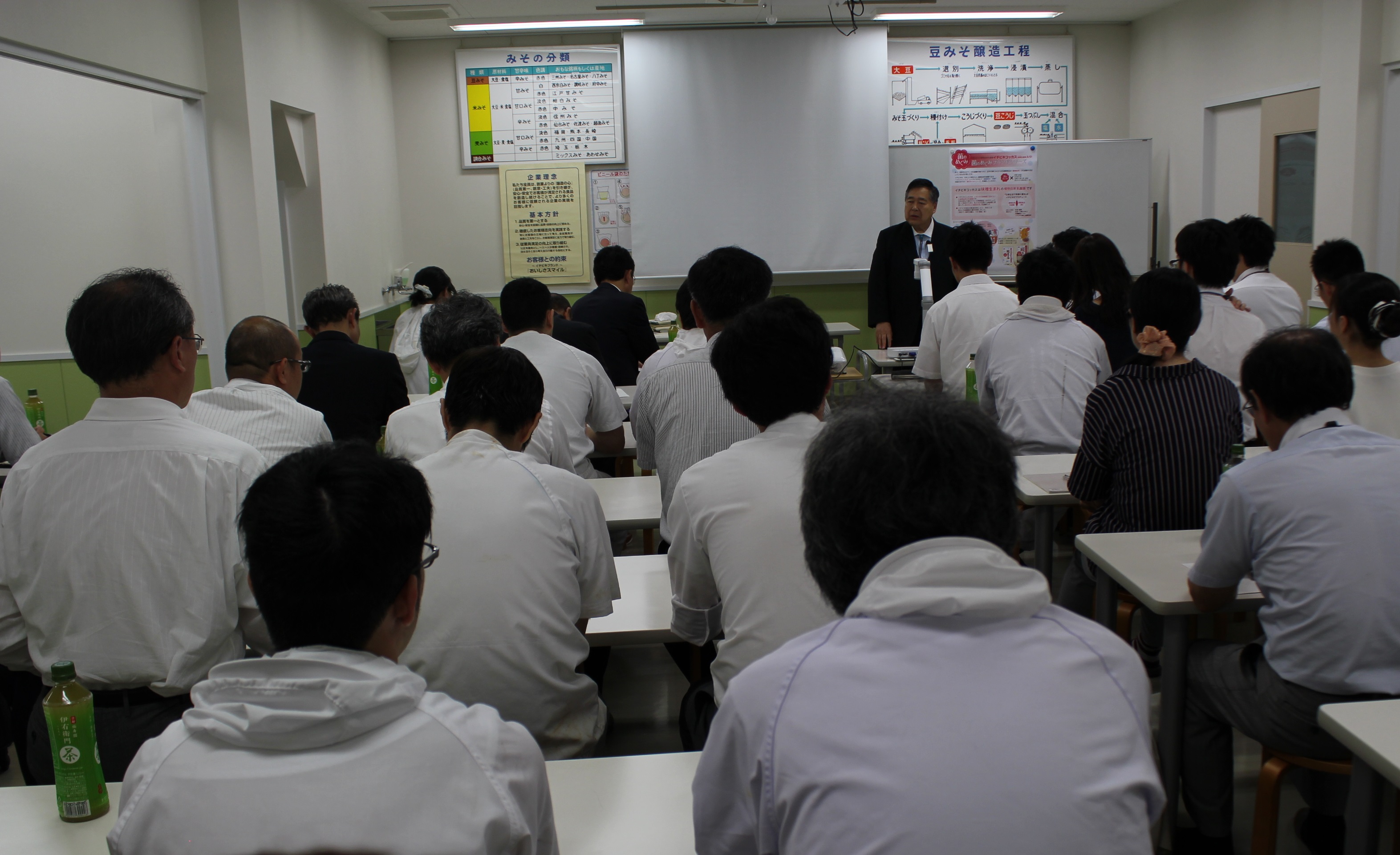 講演では、国内外の発酵食品の実例をあげ、乳酸菌等の微生物が持つ底力と可能性を解説していただきました。また、豆味噌を作る途中段階である「味噌玉」に関して、小泉先生も大変注目していることなどをお話していただきました。参加した社員は熱心に耳を傾け、講演後には質疑応答も行われました。