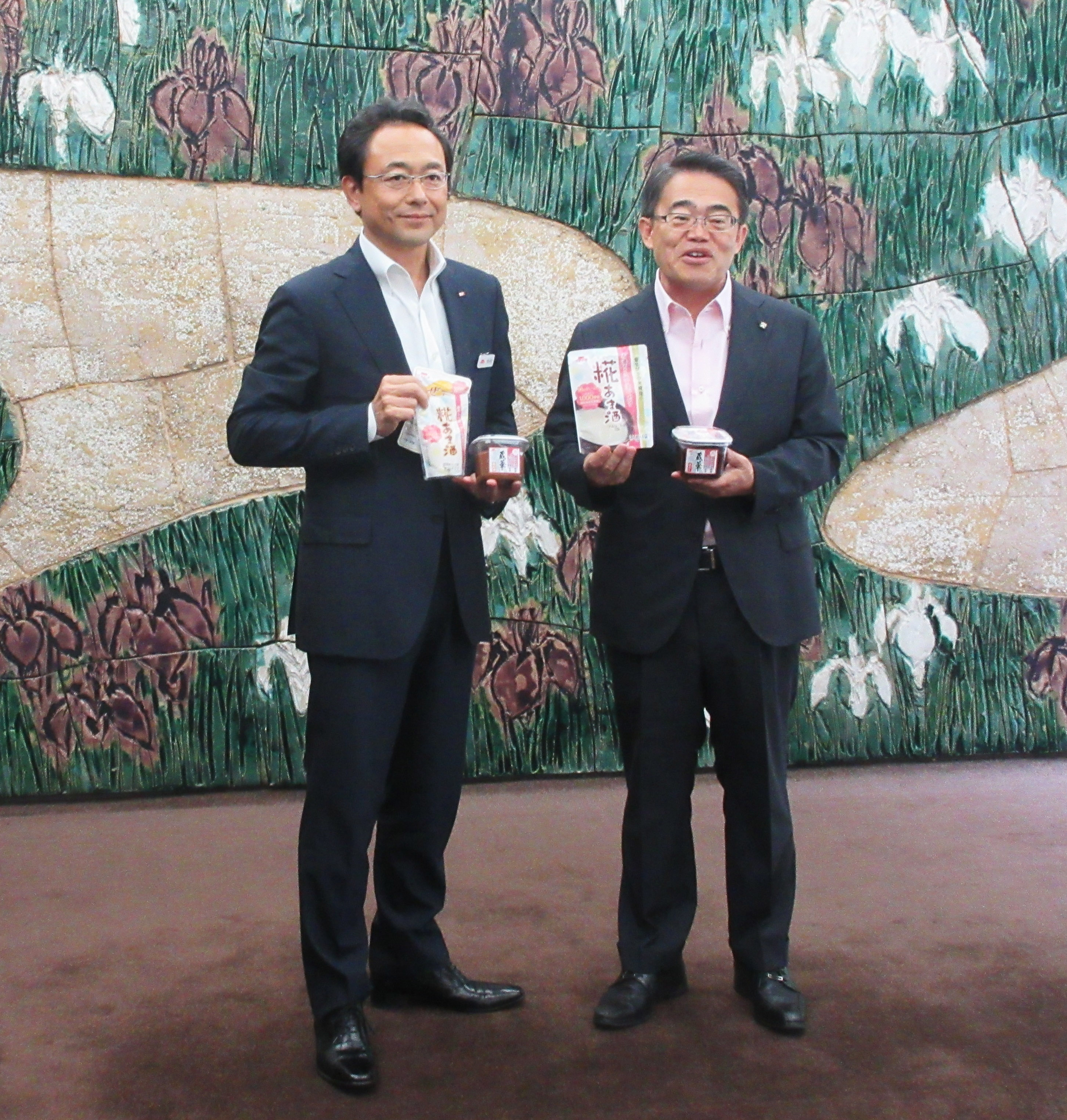 全て 2020年 2019年 2018年 2017年 2016年 2015年 大村秀章愛知県知事を訪問しました! 2017.09.11 8月29日、「新あいち創造研究開発補助金」の事業成果報告のため、大村秀章愛知県知事を訪問しました。 イチビキは「新あいち創造研究開発補助金」を活用し、独自の植物由来乳酸菌「イチビキコッカス(蔵華乳酸菌)」を使用した新ブランド「菌のめぐみ」を立ち上げ、8月18日から全7品(みそ、浅漬けの素、あま酒、ぜんざい)の販売を開始しています。 当日、大村知事には、「菌のめぐみ」ブランドの中から、「蔵華赤だし」のみそ汁と、「豆乳ぜんざい」を試食していただきました。 代表取締役社長中村と大村愛知県知事