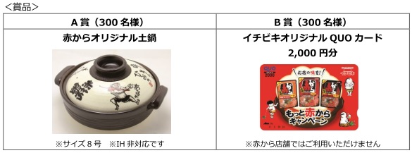 当キャンペーンは、赤からオリジナル土鍋やイチビキオリジナルQUOカード 2,000円分が合計600名様に当たります。対象商品のパッケージ正面左上にある『一番!』『三番!』『五番!』のいずれか1枚を1口とし、ハガキでご応募頂きます。
