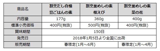 イチビキ株式会社(本社:愛知県名古屋市、代表取締役社長:中村光一郎)は、「割烹釜めしの素」シリーズから《豆ごはん》《桜えび》《菜の花》を発売し、2018年1月5日より全国へ出荷いたします。